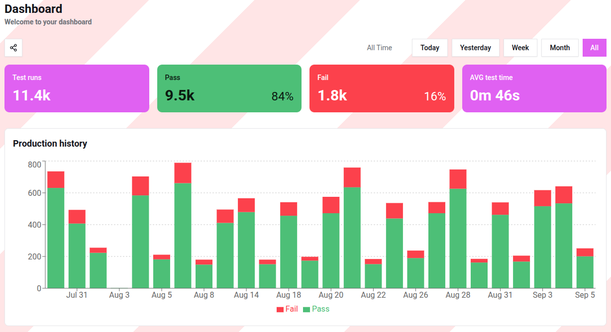 The central bar chart displays the volume of testing activity across specific dates. * Green segments represent successful test runs (Pass). * Red segments represent failed test runs (Fail).