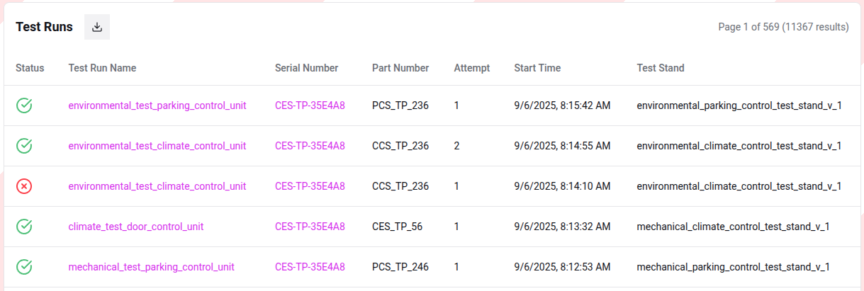 To perform external analysis or generate reports, you can download the entire dataset currently displayed in the table. * Click the Download icon (located next to the "Test Runs" header) to export the data in XLSX format.