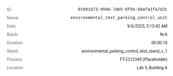 At the top of the page, a detailed information card provides the administrative and environmental context for the test. This ensures full traceability of the hardware unit within the production facility.