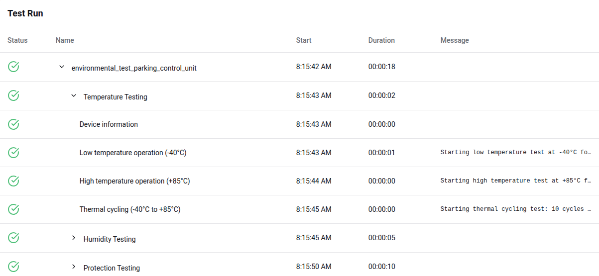 The Message column provides immediate feedback from the test stand. For example, it may display the start of a thermal cycle or specific sensor readings that triggered a failure. This level of detail allows Product Owners to distinguish between a hardware defect and a test stand calibration issue.